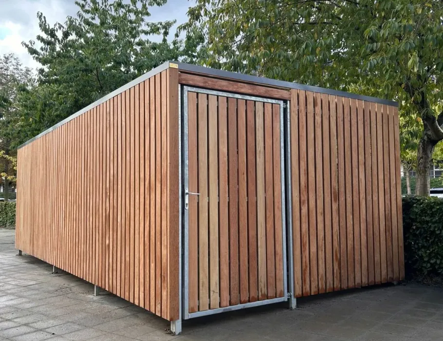 Hout geeft een warme, natuurlijke uitstraling; het stalen frame zorgt voor jarenlange stevigheid. Liever meer privacy? Dan plaatsen we de planken dichter op elkaar. Wilt u meer transparantie en ventilatie? Dan kiezen we voor een openere afwerking. Voor de indeling adviseren we aanleunbeugels of hoog/laag-rekken, afhankelijk van het beoogde aantal fietsplekken en de doorloop op piekmomenten.