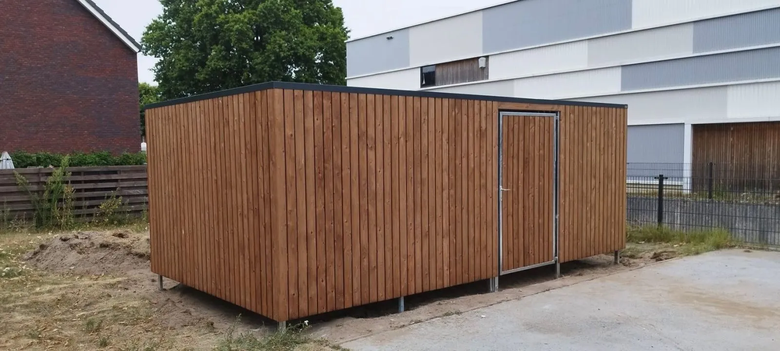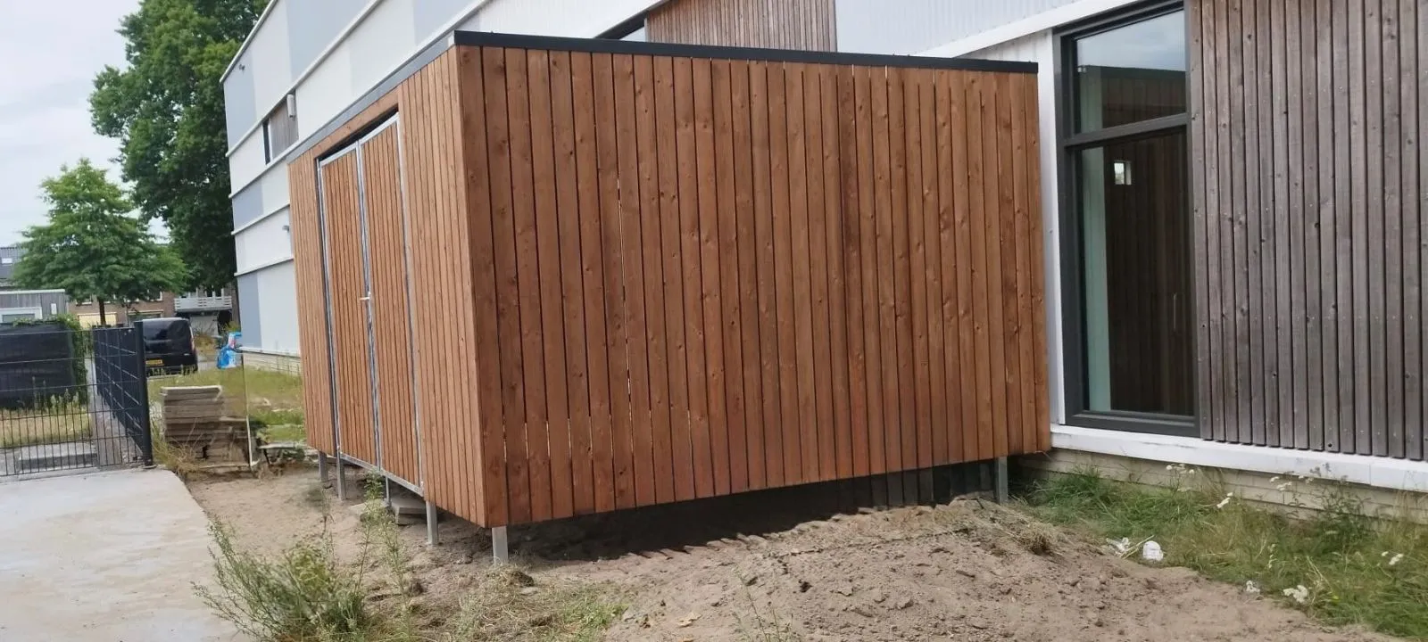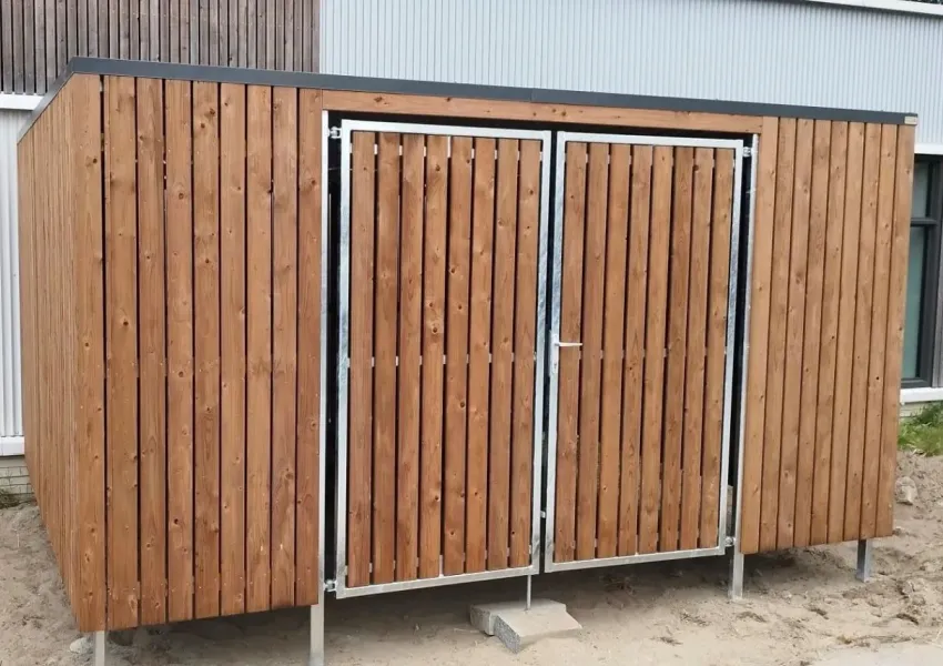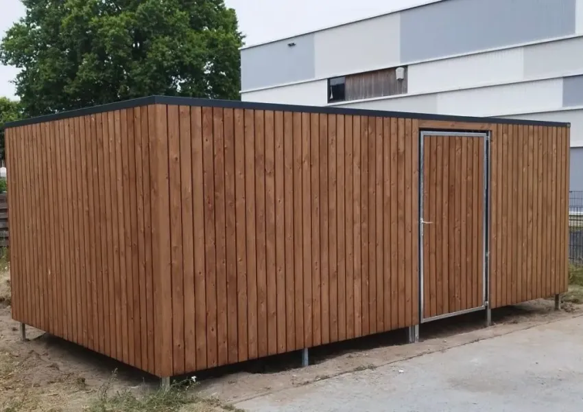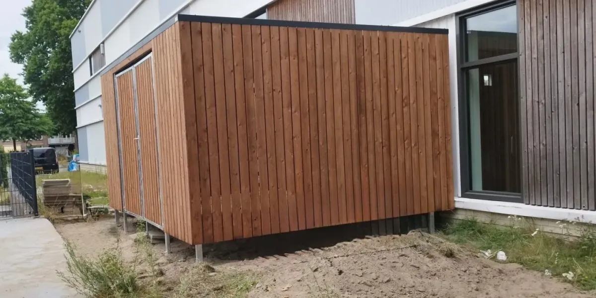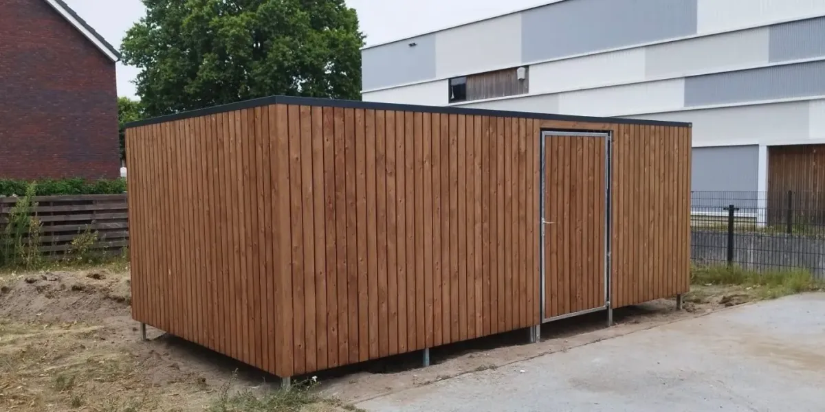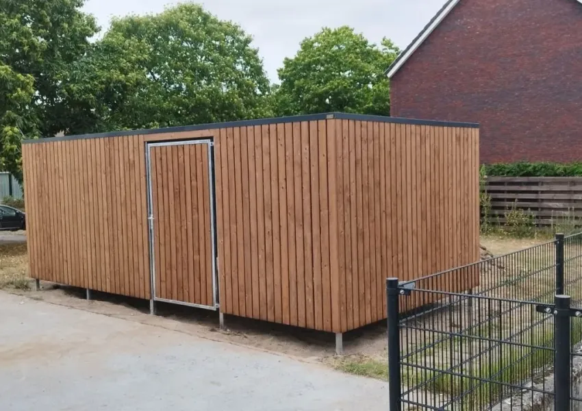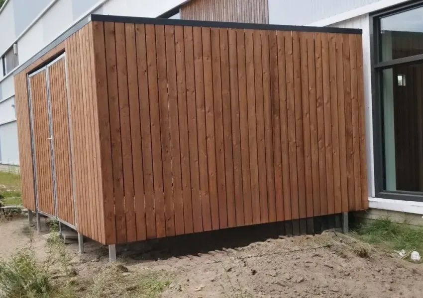 De wanden zijn bekleed met geimpregneerd vurenhout Tanalith Tanatone, zorgvuldig gemonteerd voor een nette uitstraling.