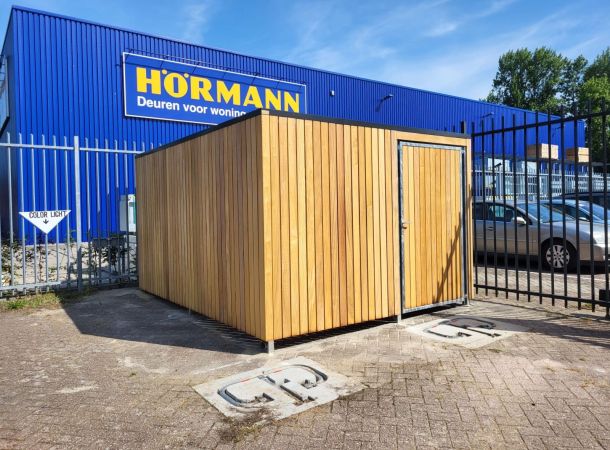 De constructie is opgebouwd uit een vuurverzinkt stalen frame, wat zorgt voor een lange levensduur en hoge weerbestendigheid. De wandbekleding bestaat uit Geimpregneerd vurenhout Tanalith Tanatone, plankafstand van 25 mm.