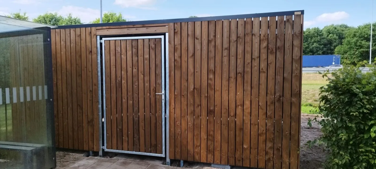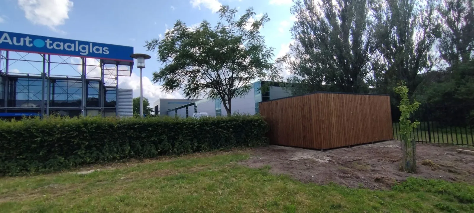 In opdracht van Autotaalglas Nederland B.V. hebben wij in Tilburg een afsluitbare fietsenberging geplaatst van hoogwaardige kwaliteit. De berging heeft een linksdraaiende deur en een buitenmaat van 530 x 410 x 234 cm.