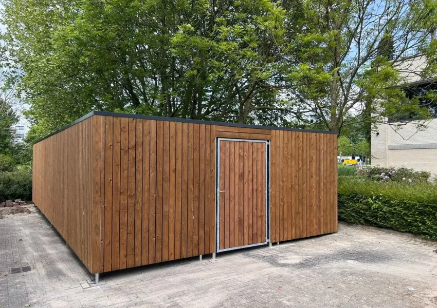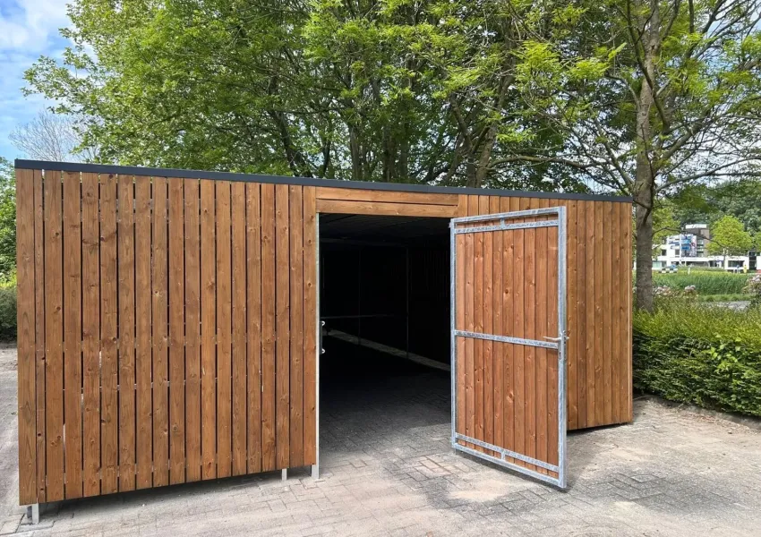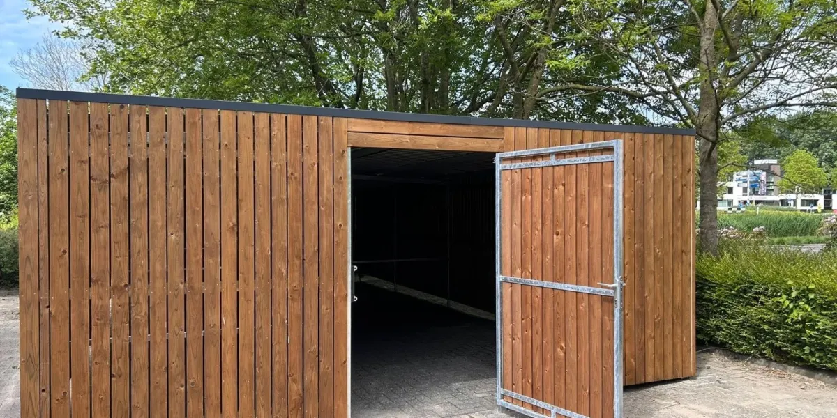 Bij Cazas Wonen in Woerden hebben wij een ruime afsluitbare fietsenberging gerealiseerd met duurzame materialen en oog voor detail. De buitenmaat van de berging is 530 x 1010 x 234 cm met een rechtsdraaiende deur.