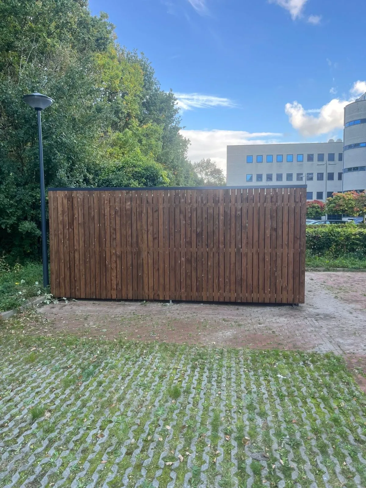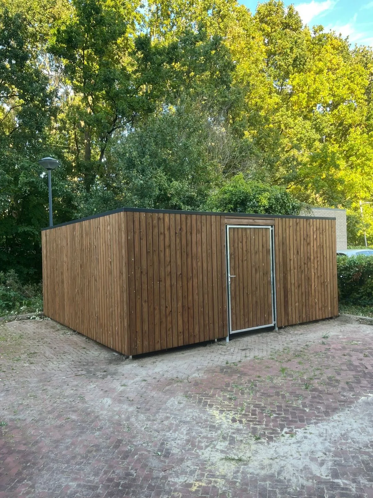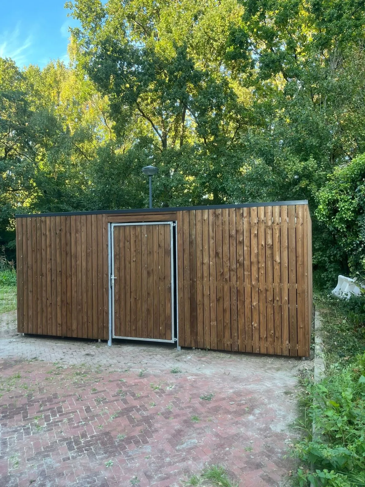 In opdracht van J.M. De Wit Goenvoorziening B.V. hebben wij in Hazerswoude-Rijndijk een afsluitbare fietsenberging geplaatst van hoogwaardige kwaliteit. De berging heeft een linksdraaiende deur en een buitenmaat van 530 x 510 x 234 cm.