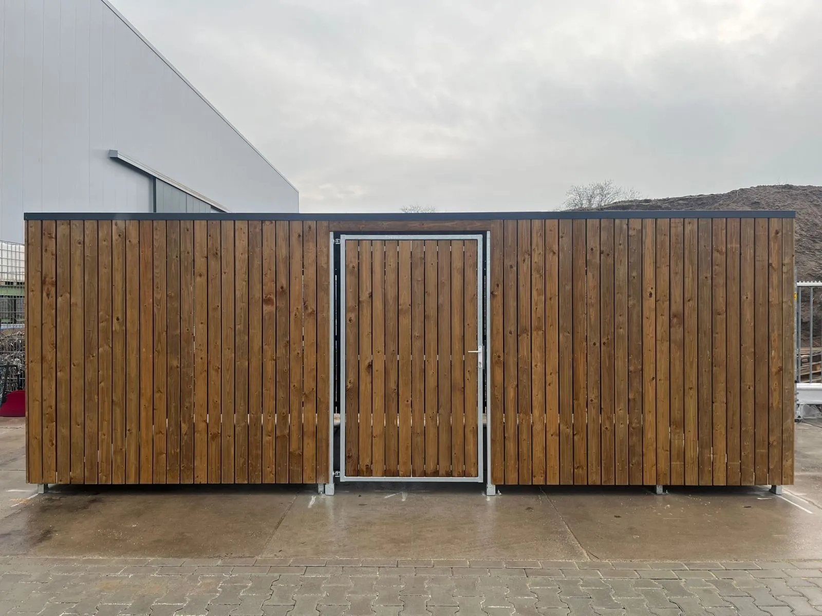 De wanden zijn bekleed met geimpregneerd vurenhout Tanalith Tanatone, zorgvuldig gemonteerd voor een nette uitstraling. Aan de achterzijde is een inpandige dakgoot aangebracht voor een efficiënte afwatering en een strak geheel.