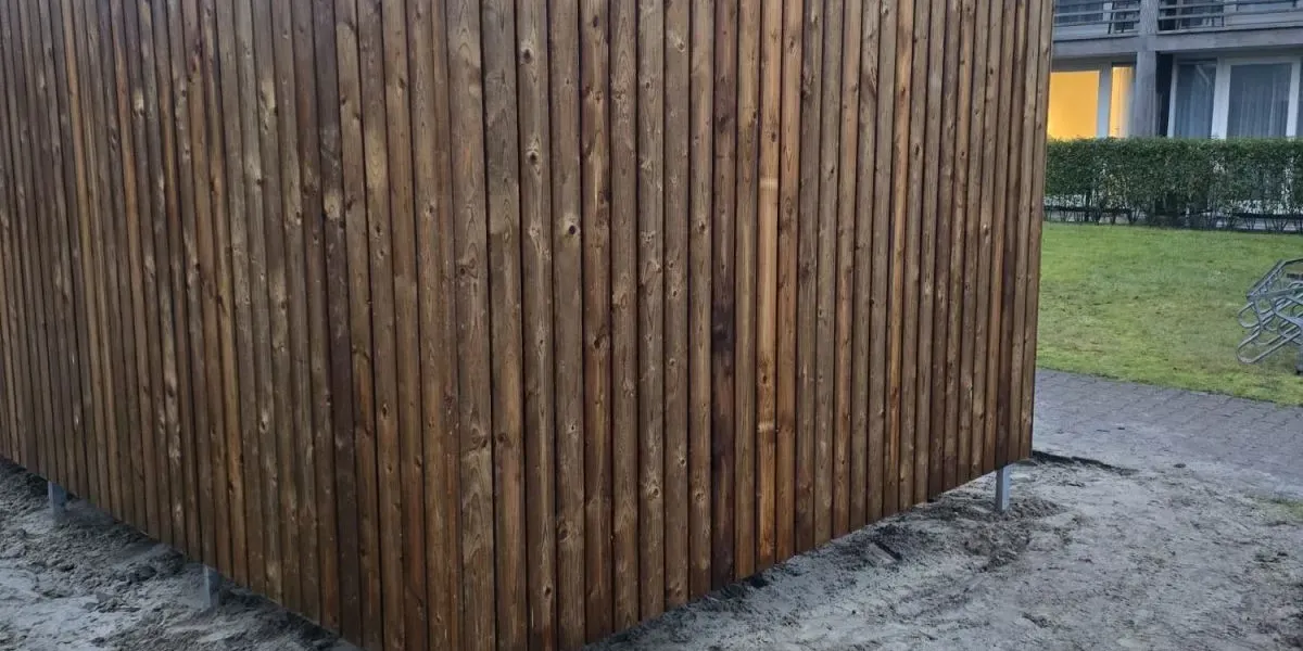 De wanden zijn bekleed met geïmpregneerd vurenhout Tanalith Tanatone, wat zorgt voor een duurzame en frisse uitstraling.