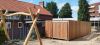 Voor de wandafwerking is gekozen voor vurenhouten planken (18 x 95 mm), geïmpregneerd, gewaxed en uitgevoerd in Tanalith Tanatone. De wanden zijn rondom op één hoogte gemonteerd en het geheel is afgewerkt met een inpandige dakgoot voor een strakke uitstraling en goede regenwaterafvoer.