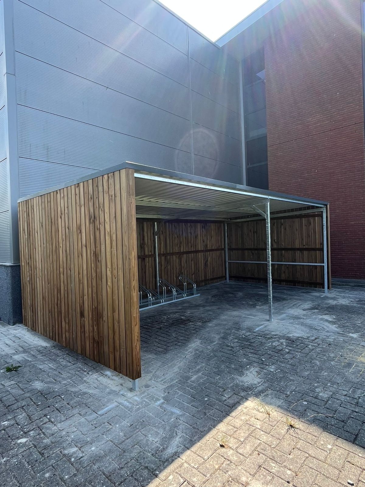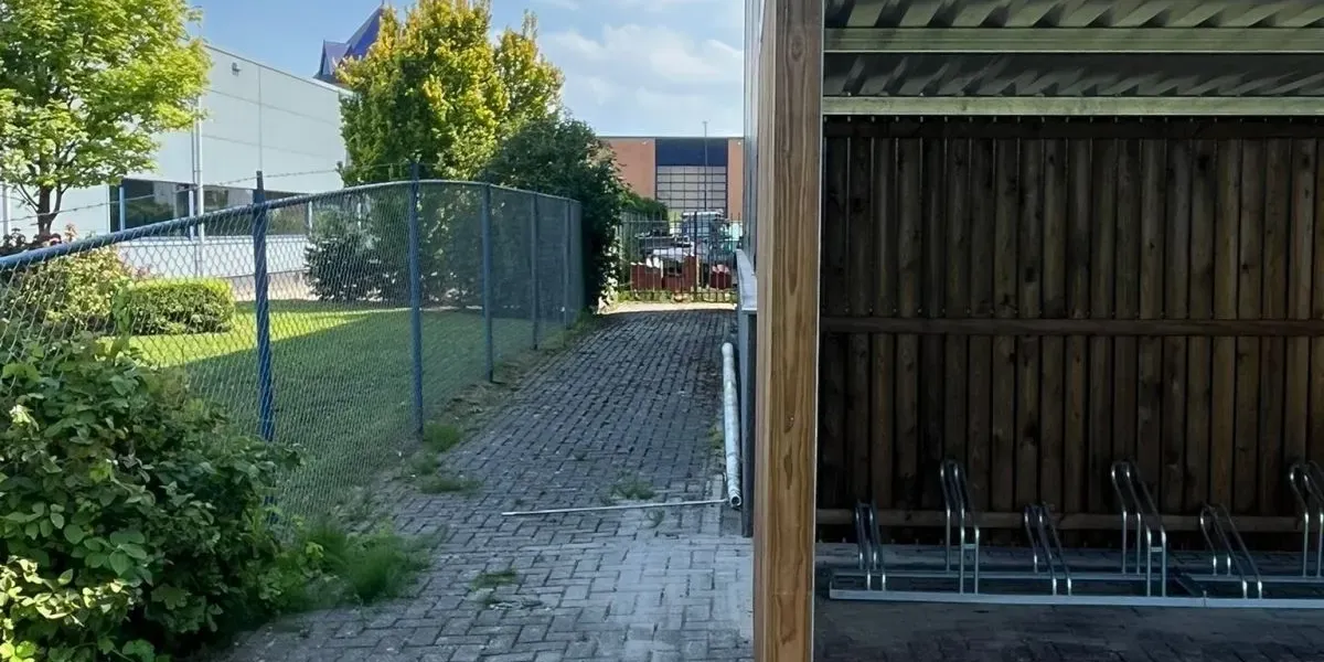 Na plaatsing is de bestaande bestrating zorgvuldig aangepast en opnieuw aangelegd rondom de staanders, waardoor de overkapping naadloos aansluit op de omgeving. Een praktische en onderhoudsvriendelijke oplossing voor het stallen van fietsen.