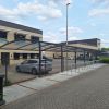 In Apeldoorn hebben we deze A401 fietsoverkapping geplaatst voor het overdekt stallen van fietsen. De overkapping is opgebouwd uit een verzinkt en gepoedercoat stalen frame en voorzien van een lichtdoorlatend polycarbonaat dak.
