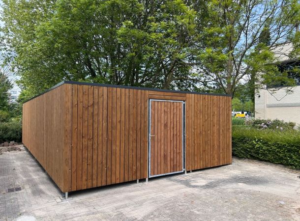 Bij Van Vliet Production B.V. in Winschoten hebben wij een ruime fietsoverkapping met afsluitbare berging geplaatst. Deze oplossing combineert open en afgesloten stalling in één constructie.