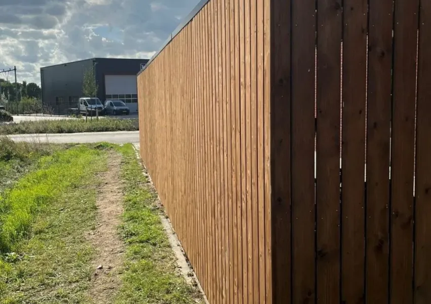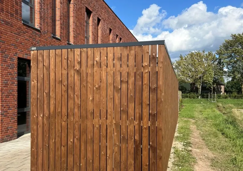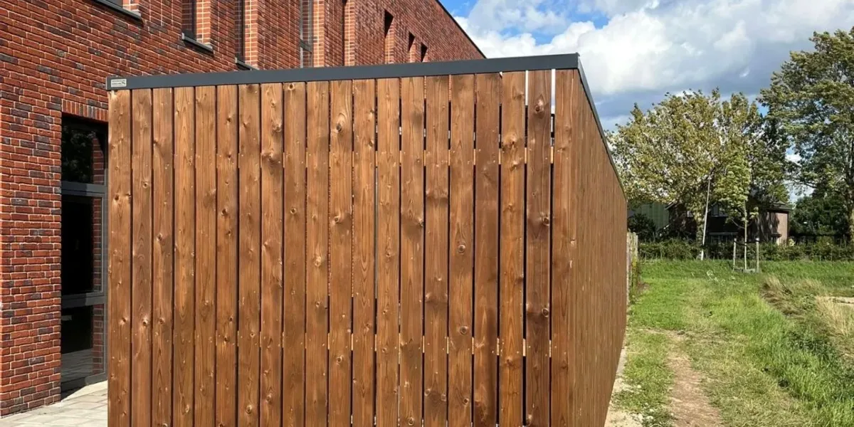 De wanden zijn uitgevoerd in geïmpregneerd vurenhout Tanalith Tanatone met een plankafstand van 10 mm. Dankzij een inpandige goot blijft het regenwater netjes afgevoerd en behoudt de constructie zijn strakke uitstraling.