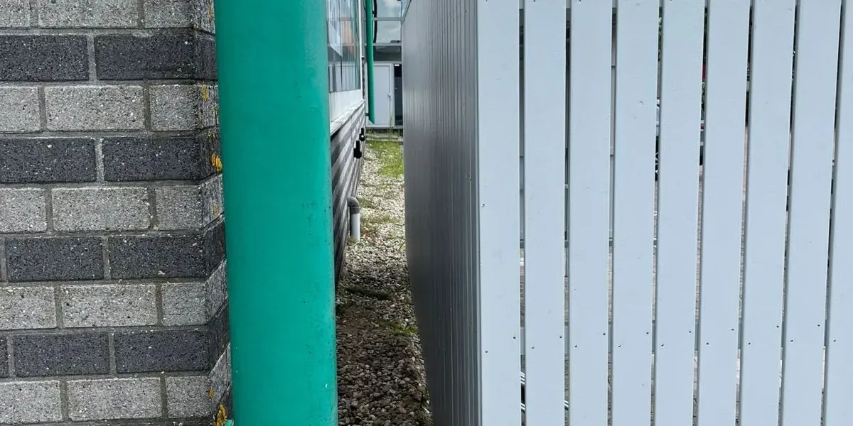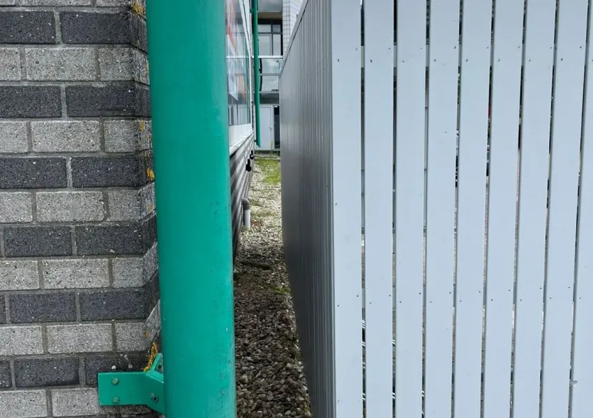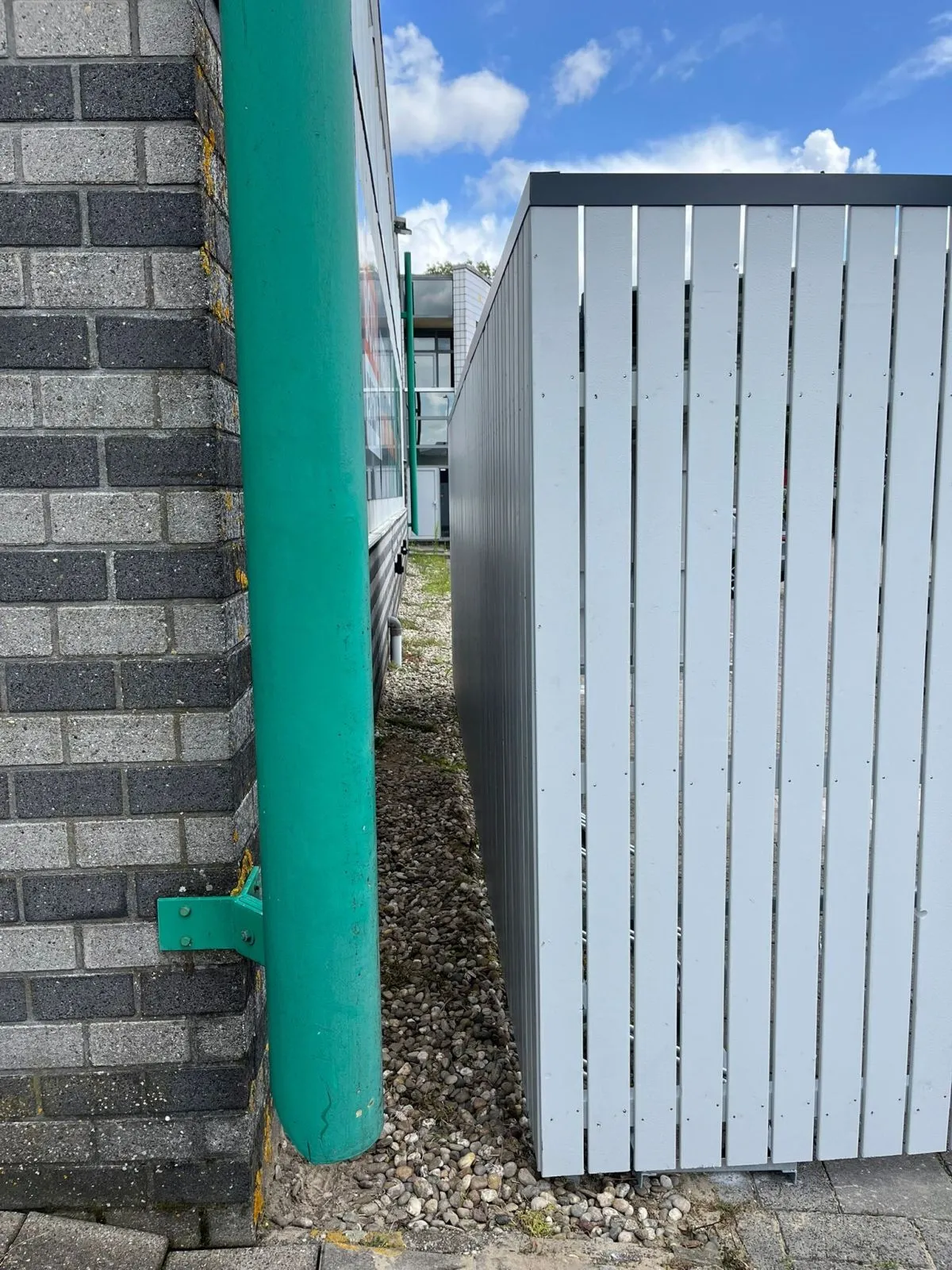De wanden zijn bekleed met geïmpregneerd vurenhout, in RAL-kleur 7035 gespoten voor een moderne look. De planken zijn verticaal gemonteerd met een tussenruimte van 10 mm, wat zorgt voor strakke afwerking.