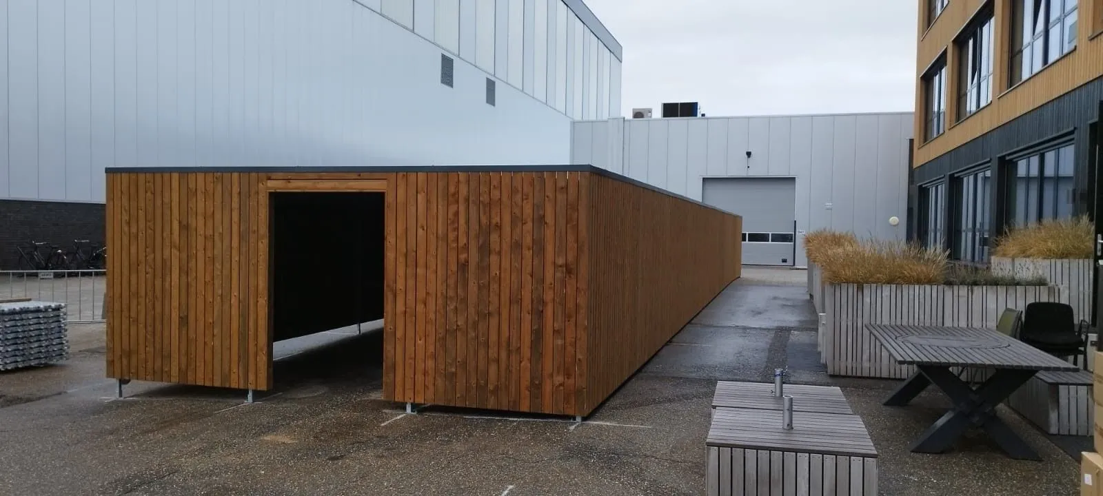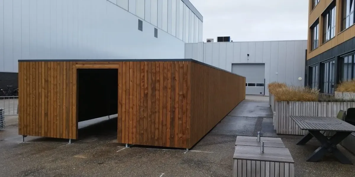 In opdracht van Gebr. Miedema van der Velde B.V. hebben wij in Makkum een gesloten fietsenberging geplaatst van hoogwaardige kwaliteit. De berging heeft een ingang met een doorgang van 115 cm en een buitenmaat van 530 x 2410 x 234 cm.