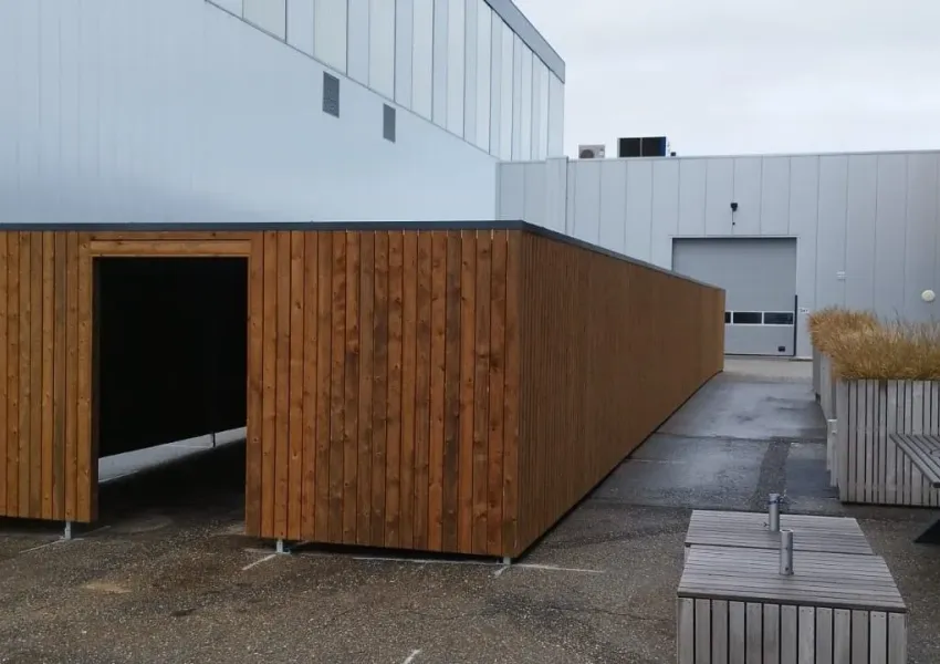 De wanden zijn bekleed met geimpregneerd vurenhout Tanalith Tanatone, zorgvuldig gemonteerd voor een nette uitstraling. Aan beide zijden is een inpandige dakgoot aangebracht voor een efficiënte afwatering en een strak geheel.